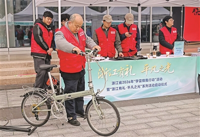 踏脚扳手、龙头专用扳手、打气筒……2月28日,浙江省2026年“学雷锋我行动”暨“浙江有礼·平凡之光”系列活动启动仪式现场,全国道德模范、杭州退休公交车驾驶员孔胜东带领志愿者摆起修自行车公益摊位。摊位上,20余件修自行车专用工具整齐排列,仿佛诉说着他四十年如一日学雷锋做志愿者的故事。