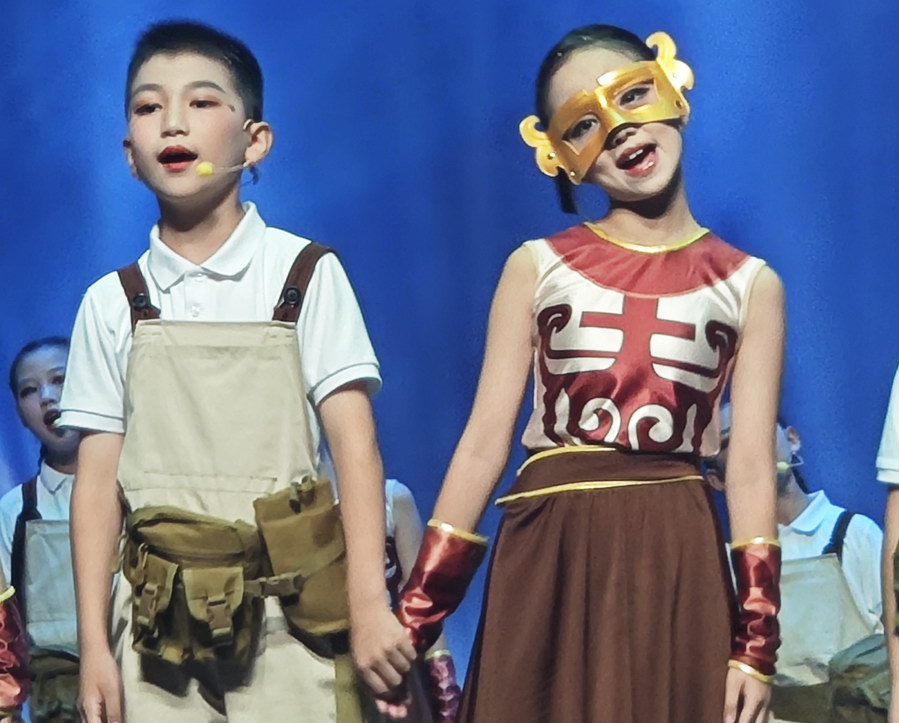 由自贡市自流井区塘坎上小学带来的歌曲《小盐娃》则以自贡自然风光、盐文化和地方美食为题材,通过儿童视角表达对家乡的热爱,并采用方言演唱形式增强地域特色。演出特地邀请了两位老人扮演老盐工,“一老一小”将舞台变成温馨的大家庭。“我们手上捧着的道具就代表了盐,这也是我们自贡的特色。”自贡市自流井区塘坎上小学三年级学生谢皓扬珍惜地捧着道具,他告诉记者,“每次我摇动道具时都很小心呢。”